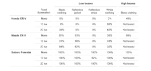 L’analisi ha valutato le prestazioni di tre auto del 2023 – Honda CR-V, Mazda CX-5 e Subaru Forester – in condizioni di scarsa illuminazione. I test, condotti con un manichino che indossava diversi tipi di abbigliamento, hanno rivelato un risultato sorprendente: mentre gli esseri umani riescono a individuare facilmente un pedone con indumenti riflettenti, alcuni sistemi AEB si sono dimostrati meno efficaci in queste situazioni rispetto a quando il manichino indossava abiti neri o bianchi.
