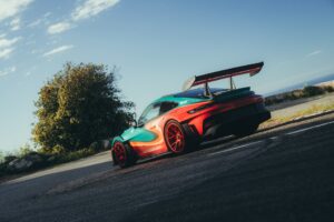 L’auto è stata configurata personalmente dall’artista, che ha scelto una livrea ispirata ai colori e all’energia del suo “Radical Optimism Tour”: turchese brillante con onde in rosso, oro e verde scuro. Il modello è dotato del Weissach Package, che include componenti in fibra di carbonio e ruote in magnesio per ridurre il peso complessivo di 22 kg.