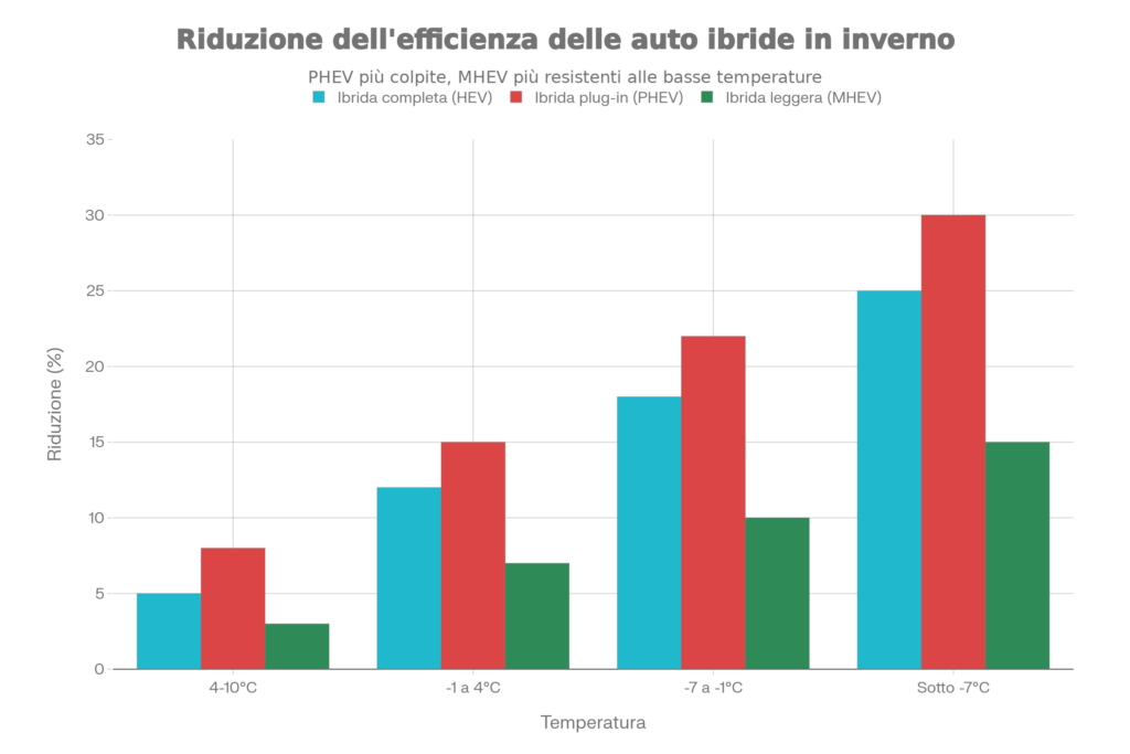 Le ibride leggere (MHEV con sistema 48V) rappresentano un’eccezione. Pur rientrando nella macrocategoria delle ibride, le cosiddette ibride leggere, in virtù delle loro batterie di piccola capacità (0,5-1 kWh), subiscono riduzioni di efficienza simili ai veicoli tradizionali (10-15%). L’accumulatore, essendo di dimensioni ridotte, è meno sensibile alle variazioni di temperatura, inoltre, contribuisce in misura minima alla trazione essendo principalmente utilizzato per assolvere alle funzioni di motorino di avviamento.