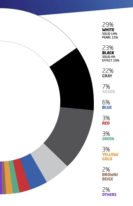 Subito dietro si collocano nero e grigio, che continuano a rappresentare la triade cromatica dominante sulle strade del mondo: