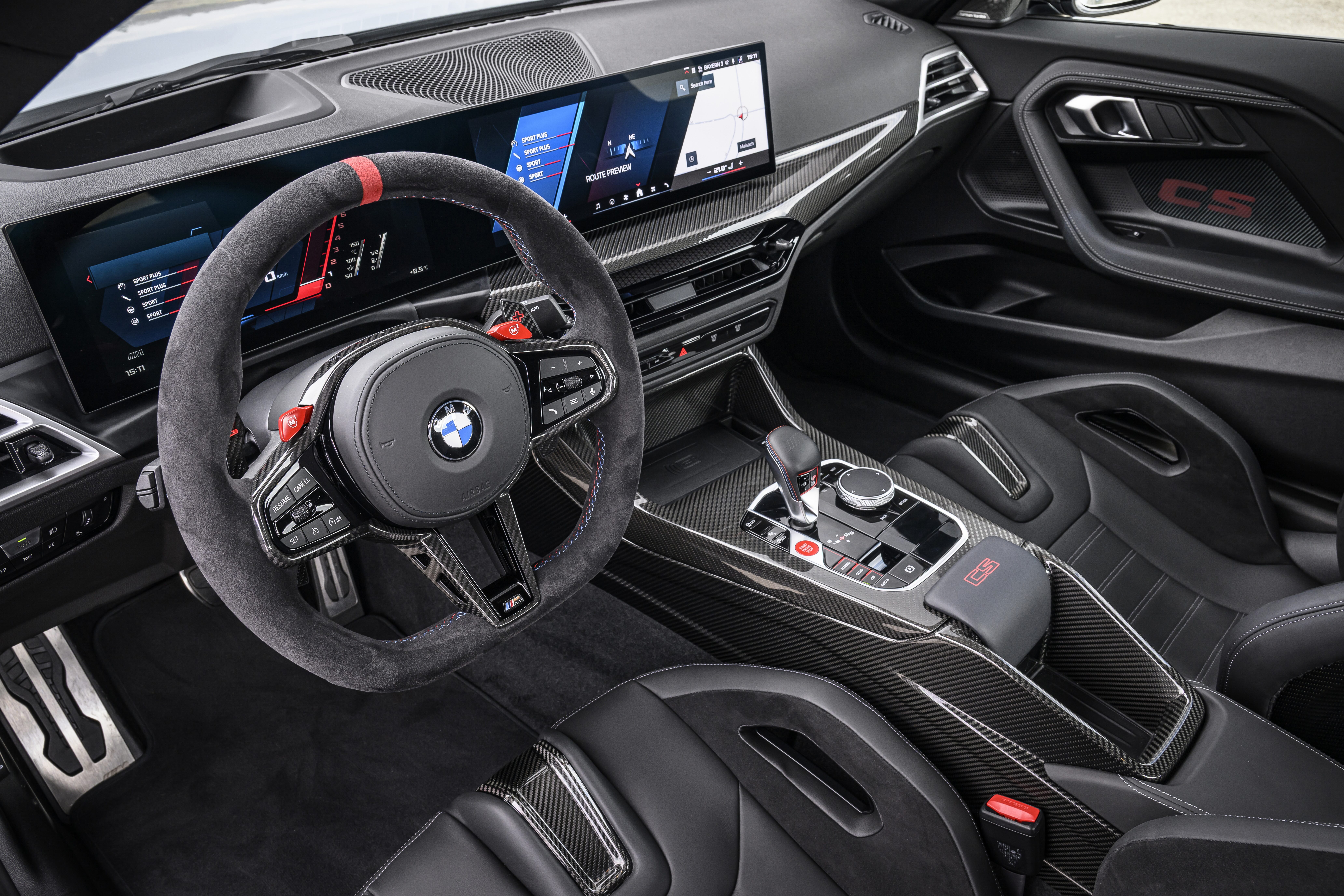 Gli interni sono la solita commistione tra lusso e sportività. Gli interni in pelle Merino e Alcantara, con sedili a guscio M Carbon riscaldabili, console centrale in CFRP, volante M in Alcantara con marcatura rossa e tasti M programmabili. La plancia è dominata dal Curved Display con strumentazione da 12,3” e display centrale da 14,9”, alimentato dal sistema operativo proprietario. Presenti il l’Head-Up Display, il sistema di navigazione Bmw Maps, e la compatibilità con Apple Car Play e Android Auto.