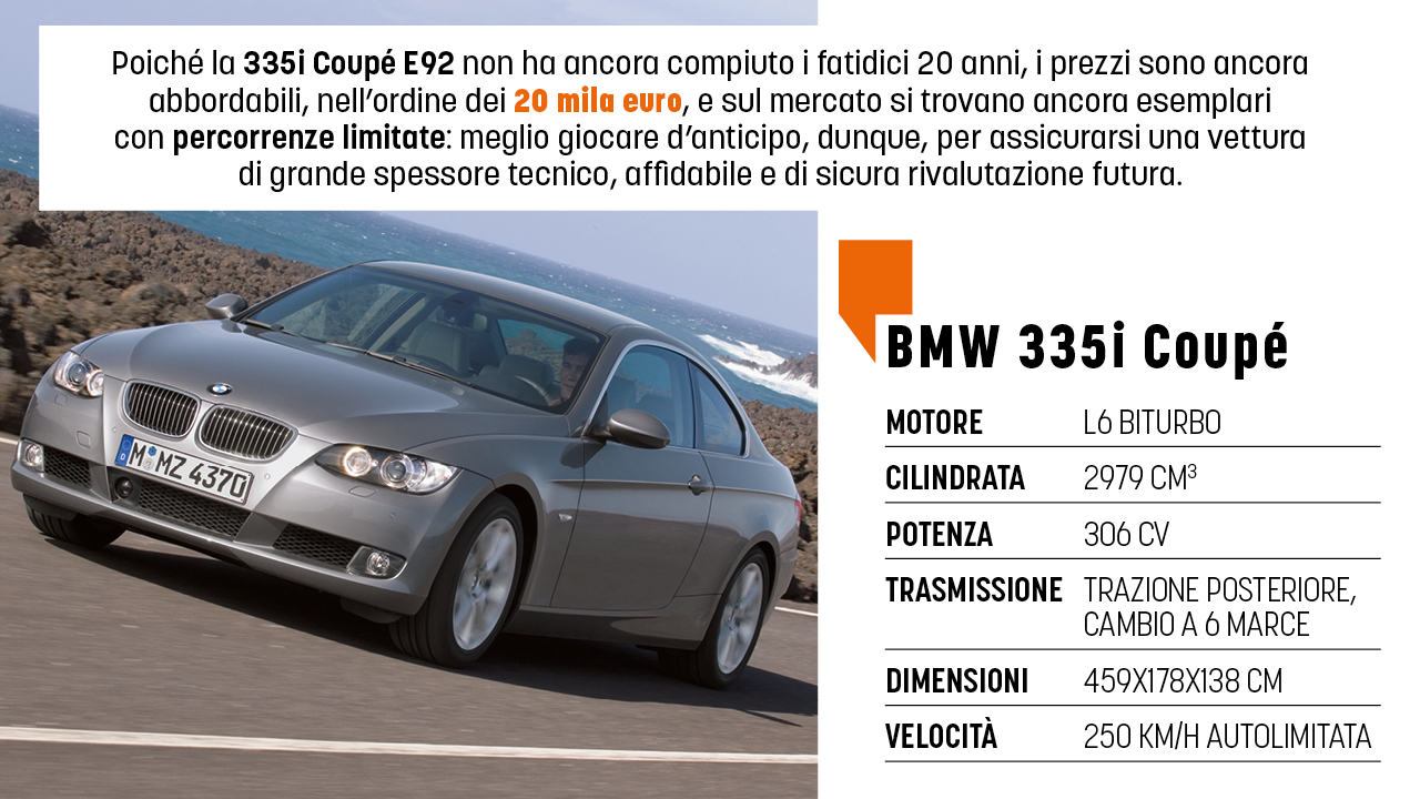 Come tutte le Serie 3 Coupé che l’hanno preceduta, anche la 335i Coupé era una sportiva a trazione posteriore, con una ripartizione delle masse tra gli assi nel rapporto di quasi 50 : 50. In alternativa, sempre a richiesta, la 335i Coupé poteva essere equipaggiata con il sistema di trazione integrale intelligente BMW xDrive. La dotazione tecnica, infine, poteva essere completata con l’Active Steering opzionale, un dispositivo che permetteva al guidatore di eseguire le manovre di parcheggio con pochi giri di volante e di assisterlo con la massima precisione durante la percorrenza delle curva ad altissima velocità. Il comparto telaio-sospensioni si affidava a uno schema McPherson a doppio snodo all’avantreno e a una sofisticata sospensione a cinque bracci al retrotreno (e qui ribadiamo: affidatevi ai Centri BMW Service certificati BMW Classic). La 335i Coupé sottolineava la sua attitudine sportiva anche nella strumentazione: come le altre Serie 3 Coupé E92 a benzina, c’era il termometro dell’olio sotto il contagiri, ma era l’unica ad avere i valori di fondoscala di tachimetro e contagiri rispettivamente a 280 km/h e 8000 giri al minuto.