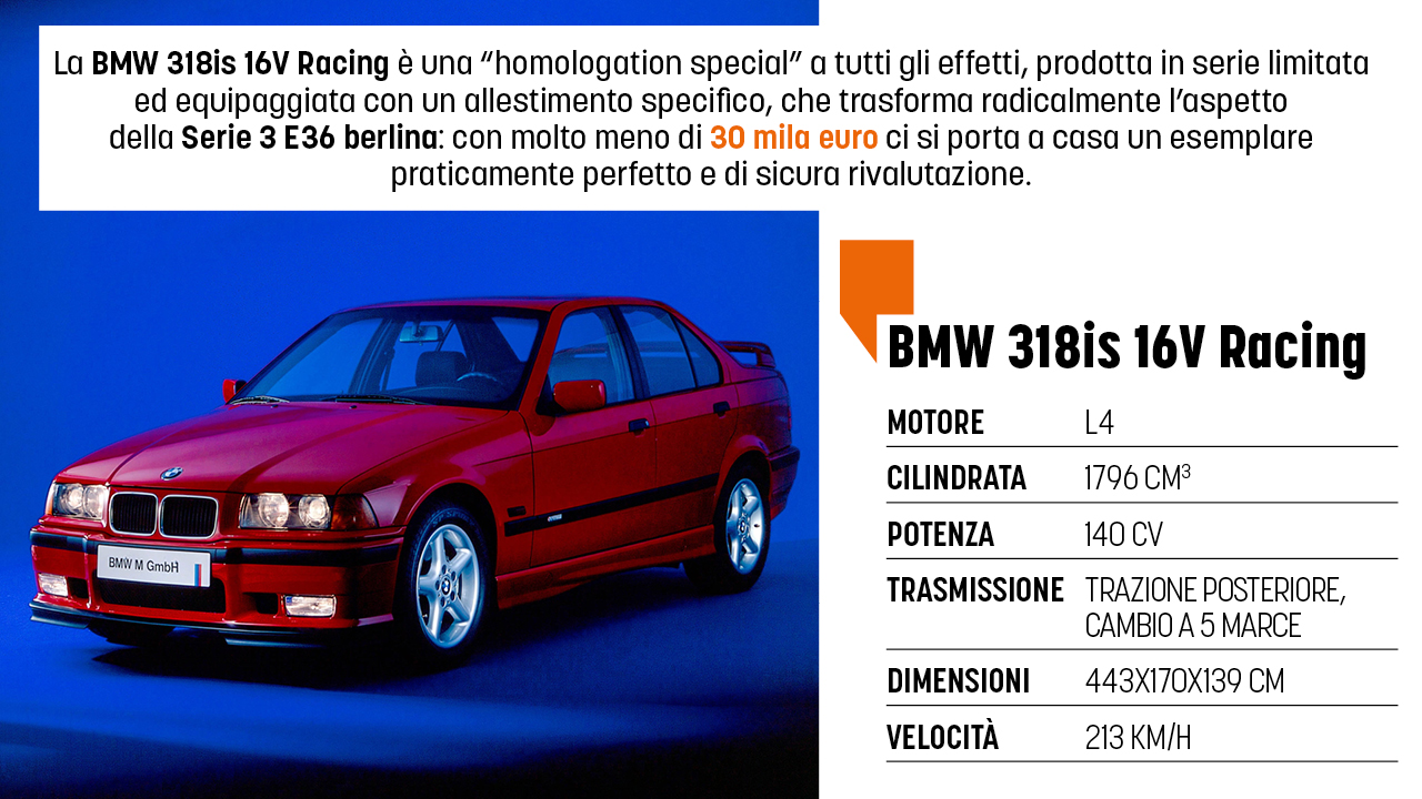 Nella seconda metà del 1993, la BMW M GmbH faceva parlare di sé annunciando il lancio di un modello unico nel suo genere, la BMW 318is 16V Racing, un’edizione limitata pensata specificamente per rispondere ai requisiti del regolamento Adac Cup Fisa Classe II per automobili di 2 litri di cilindrata. La produzione di questa edizione speciale, identificabile tramite le ultime 7 cifre del numero di telaio – che iniziavano con le lettere “FK” seguite da una sequenza numerica – prevedeva una serie di 2500 unità. La BMW 318is Racing – era chiamata così in Italia, ma era universalmente nota come E36 Classe II – era disponibile esclusivamente nella versione berlina e veniva venduta in una limitata gamma cromatica di appena sei opzioni di colore, tra cui spiccavano il raro bianco Alpino, di cui furono prodotti solo 17 esemplari, e il nero Cosmos, il più diffuso, con 1197 veicoli. Le altre tinte erano il blu Alaska (538 esemplari), verde Boston (121 unità), giallo Dakar (306 vetture) e rosso chiaro (321 esemplari).