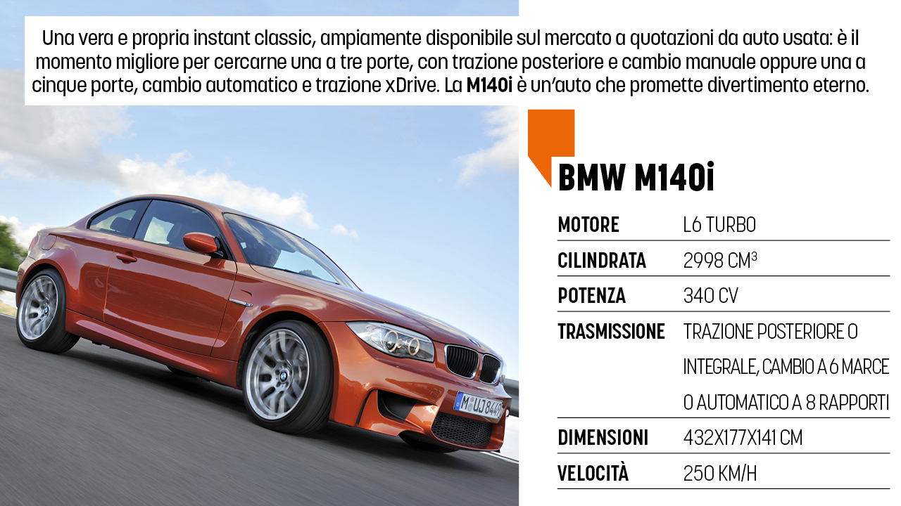 La M140i, in tutte le sue declinazioni, si caratterizzava per la sua agilità, dovuta in parte allo sterzo sportivo con servoassistenza variabile e in parte all’assetto sportivo M. L’impianto frenante sportivo M e i rapporti corti del cambio manuale a sei marce erano tarati per enfatizzare le prestazioni del sei cilindri in linea. Il pulsante Driving Experience Control della M140i offriva diverse modalità di guida: Comfort, Sport, Eco Pro e la modalità Sport+, che lasciava un margine di intervento al Dynamic Stability Control per effettuare derapate controllate. La BMW M140i è rimasta in produzione per pochissimi anni, dall’agosto del 2016 al mese di luglio del 2019 nelle configurazioni a tre e cinque porte, a trazione posteriore o integrale xDrive, con cambio manuale oppure con trasmissione automatica sportiva con convertitore di coppia. Infine, veniva offerta anche la BMW M140i Edition Shadow, un’edizione speciale contraddistinta e riconoscibile dalla cornice del doppio rene verniciata di nero lucido, dai proiettori Led con inserti neri e alle luci posteriori brunite, anch’esse con tecnologia Led.