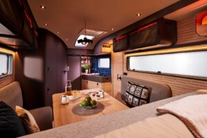 La cucina e il bagno si trovano nella parte anteriore del veicolo. Il piano cottura a induzione può essere utilizzato sia all’interno che all’esterno, mentre il bagno è dotato di scomparti nascosti che ospitano il lavandino pieghevole e altri elementi per ottimizzare lo spazio.