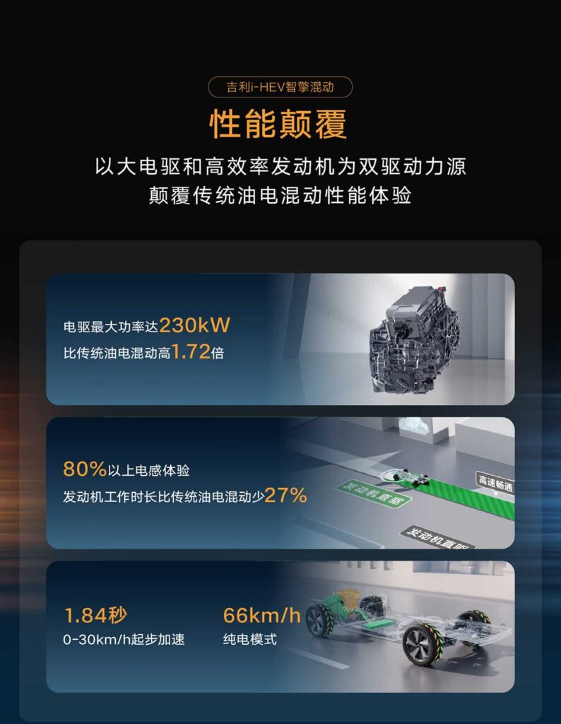 Grazie all’impiego strategico del motore a combustione con quello elettrico, Geely ha creato un layout “guidato dal motore elettrico”, capace di offrire la fluidità e la silenziosità tipiche degli EV senza la necessità di ricariche esterne.