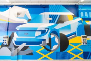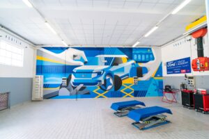 Il laboratorio non è solo tecnologia – pure all’avanguardia – ma anche cultura. Sulle pareti un murale racconta il lavoro di squadra e il legame con il quartiere Testaccio (sede dell’Istituto): un Ford Explorer reinterpretato con gli occhi dei bambini diventa una gigantesca macchinina da smontare e rimontare insieme, pezzo dopo pezzo. Un simbolo che parla ai ragazzi e ricorda che dietro ogni automobile non ci sono solo bulloni e cavi, ma storie e mani che lavorano.