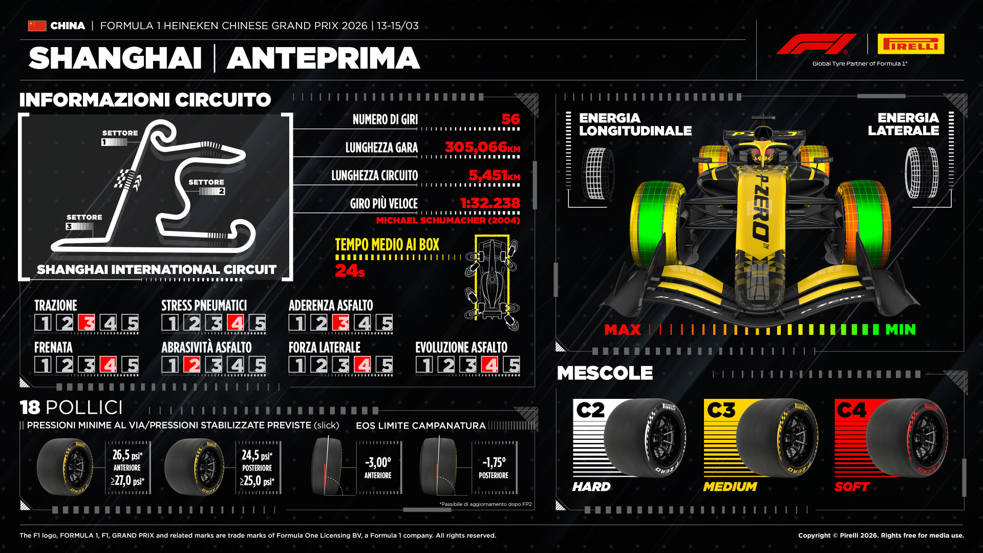 Rispetto al 2025 nel GP Cina è previsto un calo del delta di velocità tra l’inizio e la fine della frenata perché si sono ridotte le top speed. Per le curve più dure, inoltre, si sono allungati i tempi di frenata di circa il 20 per cento perché i piloti di F1 cercano di ottenere una maggiore ricarica delle batterie. A tal fine il carico esercitato sul pedale del freno è minore degli anni passati, così come sono diminuite le decelerazioni a cui sono sottoposti i piloti.