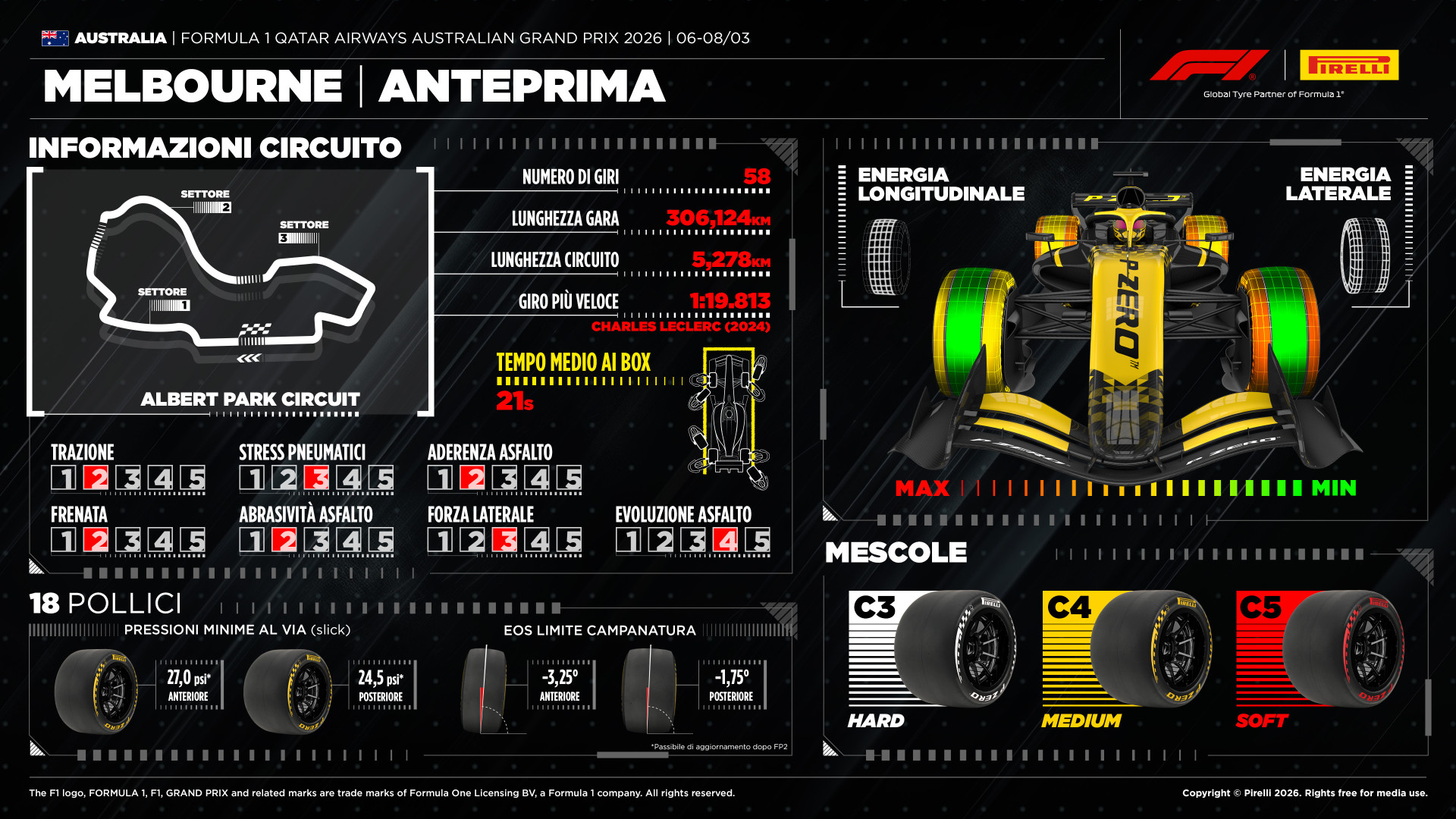 Il circuito cittadino di Albert Park si estende per 5,303 km e presenta 14 curve, di cui 9 a destra e 5 a sinistra. Situato nel cuore di Melbourne, il tracciato è ottenuto collegando le strade perimetrali che circondano il lago artificiale dell’Albert Park.