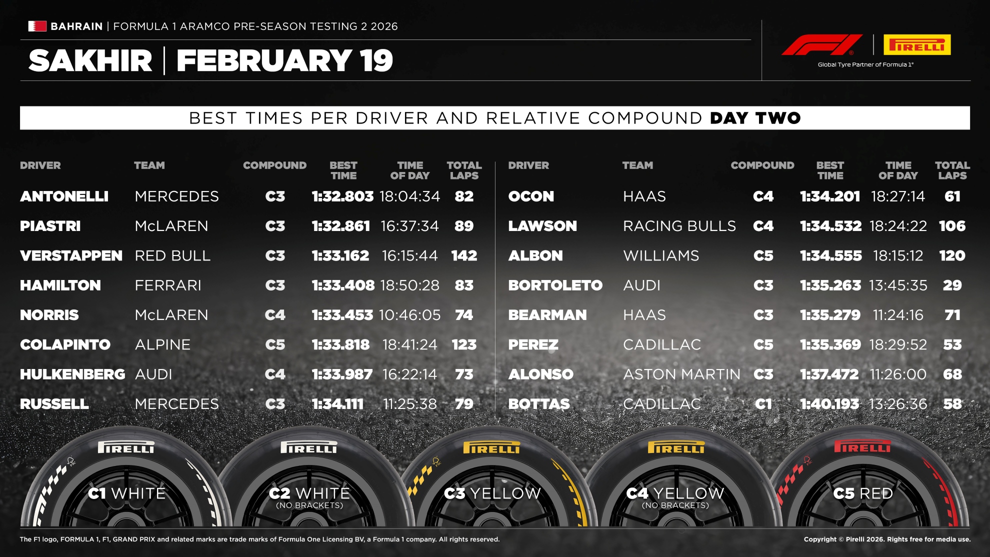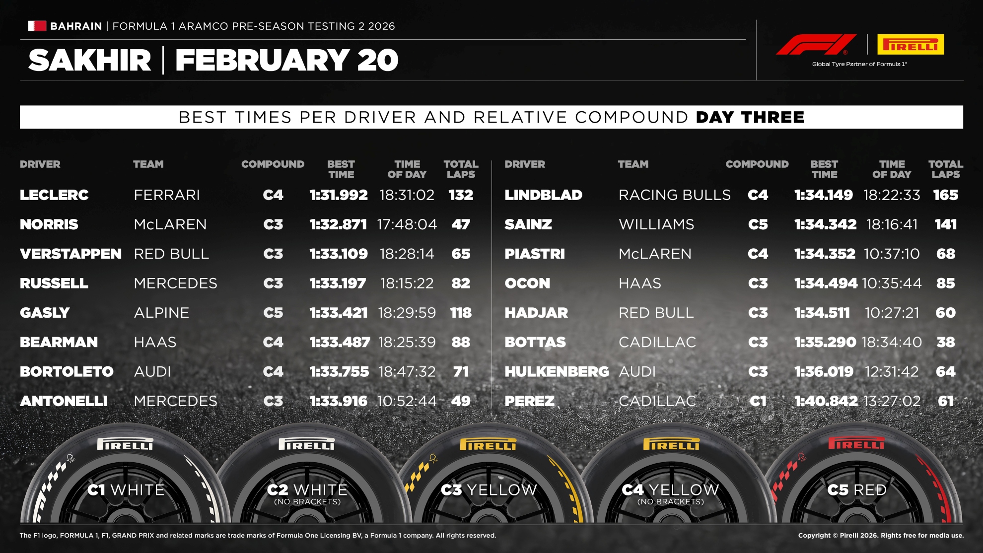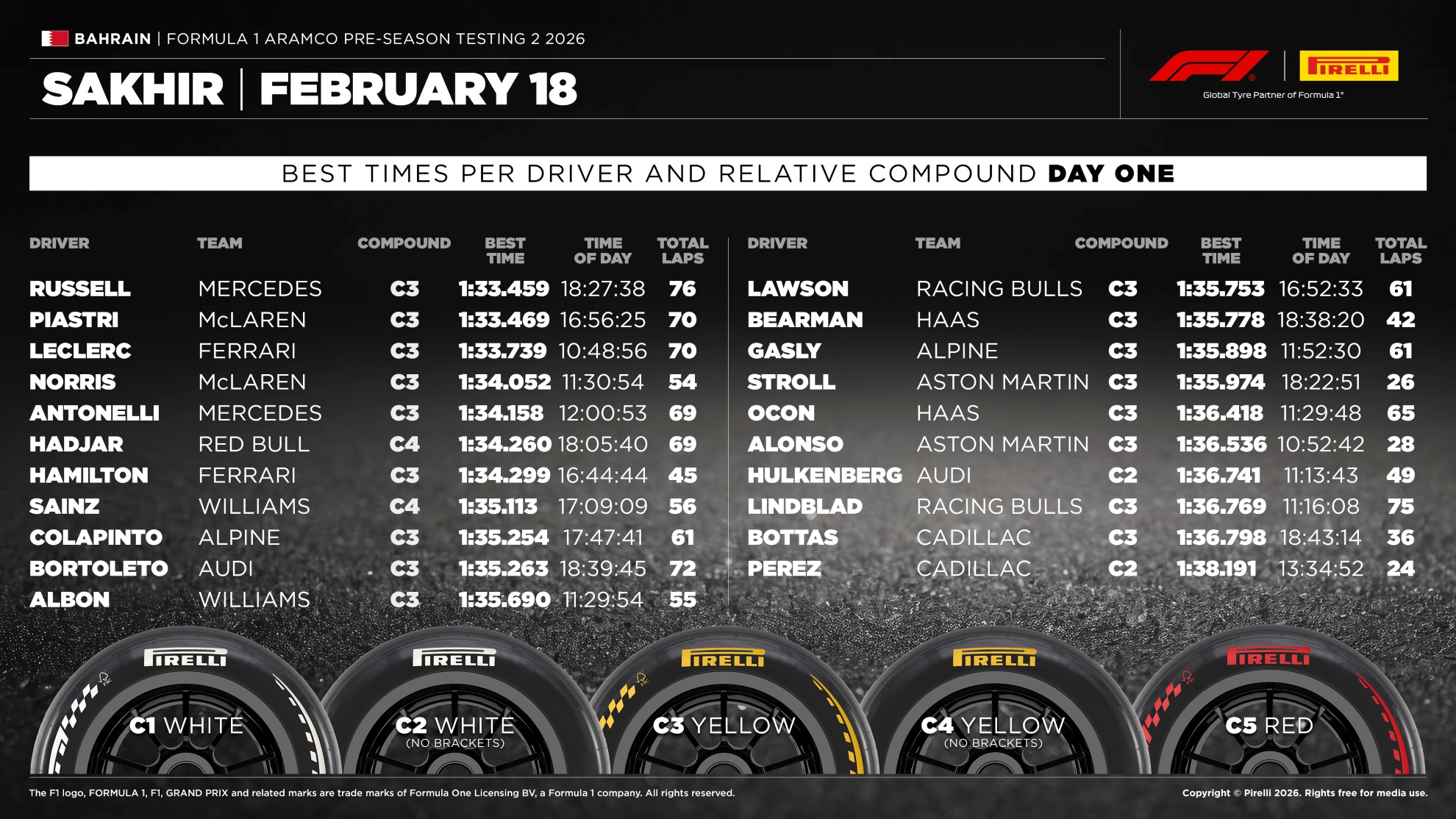 La grande protagonista di giornata è stata la mescola C3, utilizzata per il 72% dei giri totali (842 tornate). Le mescole più morbide come la C4 hanno avuto un ruolo marginale, testate solo nelle ore finali con temperature più fresche da McLaren, Red Bull e Williams, mentre la C5 non è scesa in pista. Unico grande assente di giornata è stato Max Verstappen.
