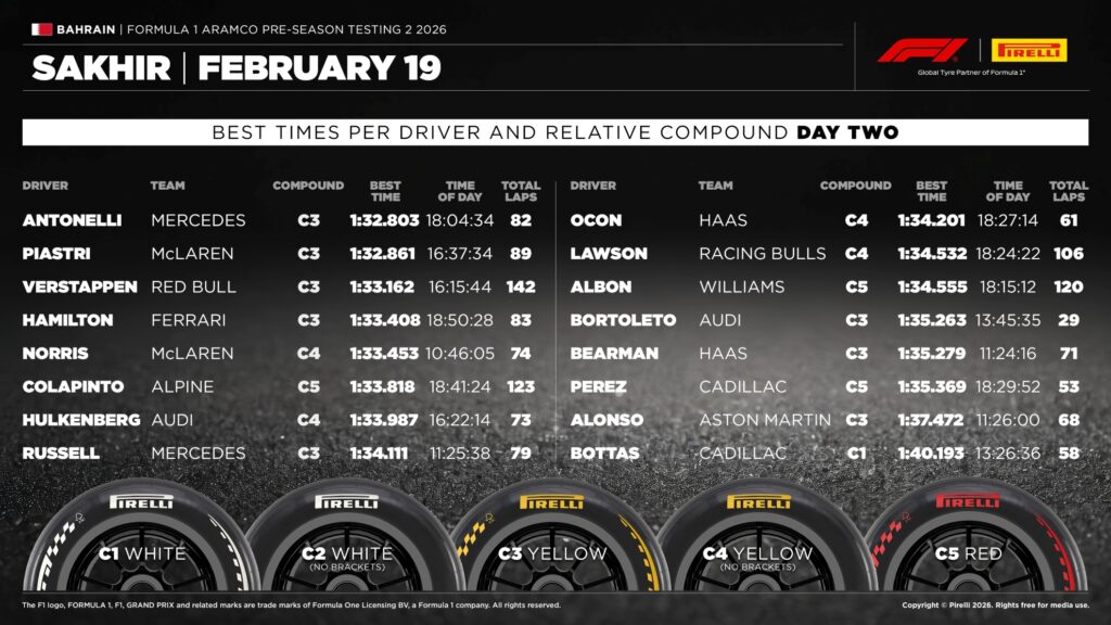 Nel secondo giorno i tempi si sono ulteriormente abbassati ed è stato ancora un pilota Mercedes, Kimi Antonelli, a segnare il giro più veloce in 1:32.803s, superando il riferimento del compagno di squadra. I programmi di lavoro dei team si sono allineati, con le scuderie impegnate a cercare il pacchetto più efficace provando soluzioni aerodinamiche e misurando il delta prestazionale tra i diversi pneumatici.