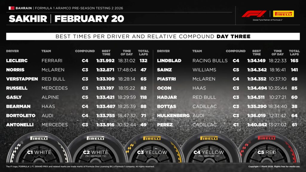L’ultima giornata ha regalato il miglior tempo assoluto dell’intera sessione di due settimane. A firmarlo, nell’ultima ora di test, è stato Charles Leclerc (Ferrari) con un impressionante 1:31.992s ottenuto su gomma C4, migliorando di otto decimi il tempo di Antonelli del giorno precedente. Il monegasco ha preceduto Norris, Verstappen e Russell.