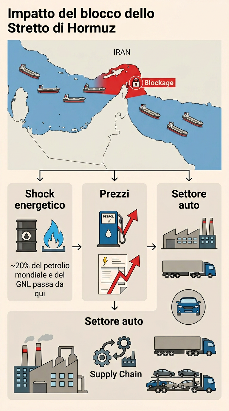 L’attuale conflitto che vede contrapposti gli Stati Uniti e Israele da una parte e l’Iran dall’altra rischia di innescare ripercussioni serie e tangibili per l’economia industriale europea. L’epicentro di questa tensione è lo Stretto di Hormuz, un cruciale snodo marittimo situato tra Iran e Oman che collega il Golfo al Mar Arabico, attraverso il quale transita una porzione vitale degli approvvigionamenti globali di petrolio e gas. In una giornata tipica, questo stretto è attraversato da petroliere che trasportano l’equivalente del 20% del consumo mondiale di petrolio, con carichi provenienti da nazioni come Arabia Saudita, Iraq, Iran, Emirati Arabi Uniti, Kuwait e Qatar. Attualmente lo Stretto di Hormuz è di fatto chiuso, con diverse navi in attesa.