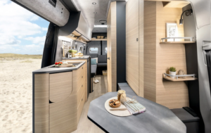 La cucina dall’altra parte è dotata di un fornello a gas a due fuochi, oltre al lavello. C’è un frigorifero a compressore da 90 litri con doppia cerniera. L’estensione del piano di lavoro ribaltabile dalla parte angolata del blocco cucina crea uno spazio di lavoro quasi avvolgente. Il prezzo consigliato dal produttore tedesco è fissato a quota 89.750 euro. Tra gli optional la possibilità di trasformare la cabina di guida in terzo letto e la tenda da sole prodotta da Thule.