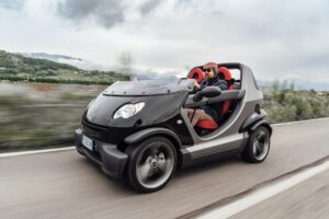La prova della Smart Crossblade, la più folle e bizzarra di tutte. Priva di tetto, barre laterali al posto delle portiere e un piccolo deflettore al posto del parabrezza. Certamente non si passa inosservati. Quando uscì nel 2002 non ebbe fortuna ma oggi è ricercatissima perché un oggetto raro.