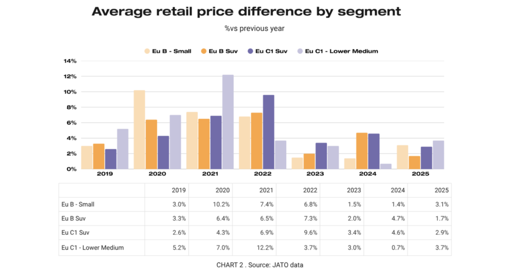 Tra i suv di segmento C e i suv di segmento B si è andati da +5.200 € nel 2018 a +7.400 € nel 2024 (+19–24% in percentuale). Mentre le carrozzerie tradizionali dei medesimi segmenti C e B sono andate da +8500 euro nel 2018 a +11.800 euro nel 2024.