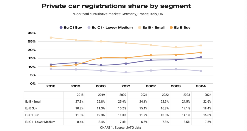 La Jato ha “fotografato” questo cambiamento con dovizia di particolari, analizzando i mutamenti dal 2018 al 2024. Nel report della Jato (qui il testo completo) è emerso che negli ultimi sette anni, quattro segmenti principali hanno dominato il mercato privato aggregato in Europa (i mercati dell’auto più grandi sono quelli di Germania, Francia, Italia e Regno Unito), rappresentando circa il 60% delle immatricolazioni totali:
