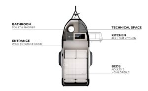 La cucina è altrettanto particolare, essendo metà dentro e metà fuori. I rendering mostrano il piano cottura a gas che scivola fuori dal telaio del rimorchio quando è il momento di preparare i pasti e poi si infila nello spazio del bagno in modalità viaggio. Altri servizi e accessori previsti includono riscaldamento, acqua calda, un sistema di intrattenimento con TV e altoparlante Bluetooth, un centro di comando touchscreen con app mobile e un sistema di allarme intelligente.