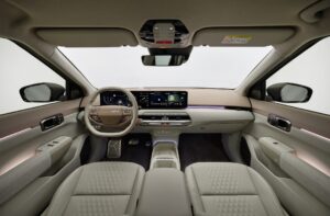 Saliti a bordo siamo avvolti in un ambiente moderno dal design minimalista. Al centro della plancia troviamo un “palcoscenico” digitale da 30 pollici che comprende il display della strumentazione da 12,3 pollici, uno schermo da 5,3 centrale dove sono racchiuse le funzioni di climatizzazione e il display dell’infotainment da 12,3 pollici di diagonale che prevede aggiornamenti over the air e offre la possibilità, quando si è fermi, di godersi un film su Netflix o Disney +, divertirsi con giochi e karaoke. E in più con la funzione Teatro ottimizza impostazioni quali illuminazione interna e il sistema audio a otto altoparlanti (è disponibile anche un sistema Harmon/Kardon opzionale a otto altoparlanti) per offrire un’esperienza di visualizzazione dei contenuti eccezionale. All’opposto è possibile scegliere anche la modalità Riposo che crea un’atmosfera rilassante attivando le funzioni massaggiante del sedile e impostando le luci soffuse in abitacolo.
