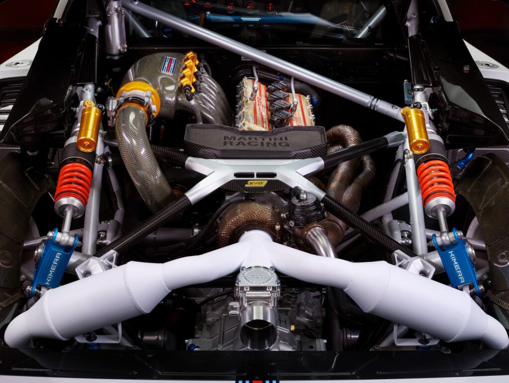 Sotto la carrozzeria, che è realizzata in carbonio a vista e carbon kevlar, con cerchi a fissaggio monodado e fanali supplementari da rally, c’è un lavoro tecnico sostanziale, completamente “analogico”. Il quattro cilindri 2.1 litri a doppia sovralimentazione della EVO38 arriva qui a 640 Cv grazie al sistema Flex Fuel, compatibile con biocarburanti tra cui l’etanolo E85. La coppia cresce del 22% rispetto alla versione standard, sfiorando i 700 Nm, con un allungo che si estende fino a 8.200 giri. Il tutto con un peso di 1.100 kg.