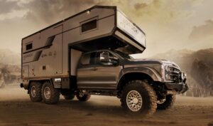 Ci sono poi sospensioni pneumatiche posteriori a otto bracci, differenziali a slittamento limitato e pneumatici da 20 pollici avvolti in massicci pneumatici Continental da 43 pollici. Un sistema di regolazione della pressione, consente di gonfiare e sgonfiare gli pneumatici in caso di necessità. Detto questo per spostarsi da un punto A ad uno B in giro per il mondo, vi basta sapere che sotto il cofano ci sia il V8 turbodiesel Power Stroke di Ford da 6,7 litri e 330 di potenza, coadiuvato da un cambio automatico a 10 velocità.