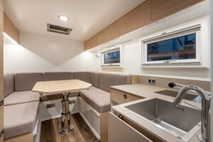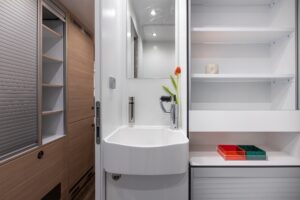 La cellula abitativa è formata da pareti sandwich in vetroresina/polistirolo spesse 6 cm. L’impianto elettrico Victron è incentrato su un banco di batterie al litio da 1.980 Ah, collegato a un inverter da 4.000 W e a un sistema di pannelli solari da 1.450 W. Il sistema idrico di bordo è completo di hardware a doppia filtrazione comprendente un prefiltro a tre fasi e una lampada UV Purion 1000 che può uccidere microrganismi pericolosi fino a minuscoli virus. Il Bedrock trasporta 450 litri di acqua dolce e 225 litri di acque grigie.