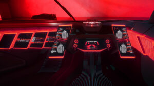 Quando l’auto è parcheggiata, i conducenti possono utilizzare un casco speciale per competere in esperienze di corsa virtuali utilizzando il volante e i pedali reali. A proposito la grafica del display e del quadro strumenti è stata progettata in collaborazione con Polyphony Digital, il team dietro la simulazione di corse di Gran Turismo. Due le modalità, GT e R, che trasformano l’atmosfera in abitacolo.