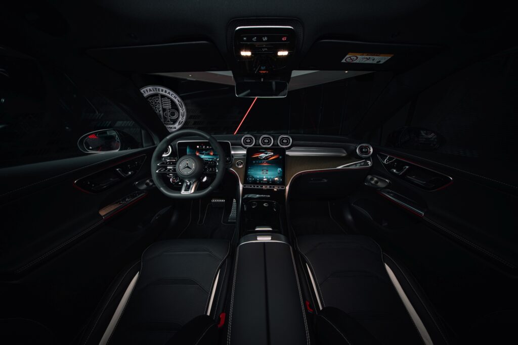 L’abitacolo riflette la sportività esterna con sedili sportivi AMG in pelle nera e cuciture a contrasto dorate (nel pacchetto Golden Accents). Le finiture sono in carbonio con filo metallico intrecciato. Il sistema multimediale MBUX integra schermate specifiche AMG per monitorare parametri come temperatura motore, assetto e dati telemetrici in tempo reale.