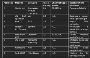 L’outsider è la Mitsubishi ASX, quarta, che ha registrato un tasso di difetti del 2,7%, dimostrando che anche un crossover economico può garantire ottimi risultati.