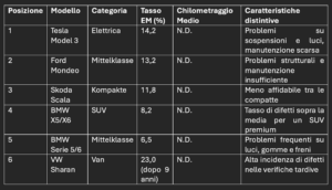 Sfortunate protagoniste tra le auto meno affidabili troviamo anche la Ford Mondeo e la Skoda Scala, che con tassi EM rispettivamente del 13,2% e dell’11,8%, evidenziano diverse carenze.