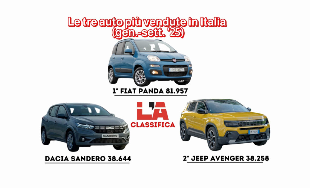 Il mercato delle auto più vendute in Italia nei primi nove mesi del 2025 conferma le “vecchie dinamiche”, anche se non mancano novità provenienti dalla Cina (QUI il nostro speciale). La regina indiscussa rimane Fiat Panda, con 81.957 unità immatricolate, quasi il doppio rispetto alla seconda in classifica, che si conferma la Dacia Sandero. Un risultato che testimonia la resilienza del modello Fiat, con gli ingredienti che ne hanno decretato il successo in questi anni: dimensioni compatte, costi contenuti e praticità.