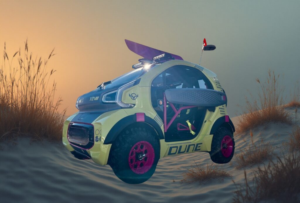 La Xev YoYo Dune è una versione speciale e audace della microcar cinese progettata a Torino. Si distingue per ruote tassellate XXL, livrea appariscente e portapacchi sul tetto pronto ad accogliere una tavola da surf. Un concept creativo, ma non si esclude la produzione in una piccola serie limitata.