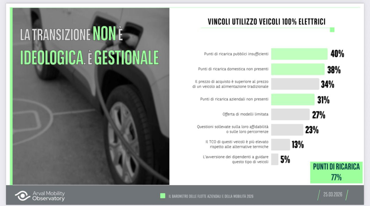 In genere, quando si parla di elettrificazione delle flotte aziendali, il dibattito si concentra quasi sempre sugli stessi temi: autonomia, costo di acquisto, valore residuo, disponibilità di modelli. Domande sicuramente legittime, ma che rischiano di distogliere l’attenzione da un nodo più profondo e meno superficiale. Secondo il Barometro delle Flotte e della Mobilità 2026, condotto dall’osservatorio Arval su oltre 300 aziende italiane, il vero ostacolo all’elettrificazione non è tecnologico ma organizzativo.