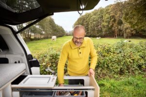 Il sistema letto prevede due cassetti, di cui uno è di fatto il frigorifero a compressore da 31 litri di capacità. Mentre quello lato passeggero può essere utilizzato come ripostiglio. Tra i due presenzia una tanica d’acqua da 12 litri che alimenta il lavandino. Il tubo è estensibile e può essere utilizzato all’esterno come doccia. Il piano cottura a induzione non funziona con la batteria dell’ID.Buzz. Ecco perché lo specialista olandese ha pensato ad una stazione di alimentazione al litio all-in-one opzionale e hardware per la ricarica solare. Prezzo del kit? Non moltissimo in senso assoluto: 4.955 euro.