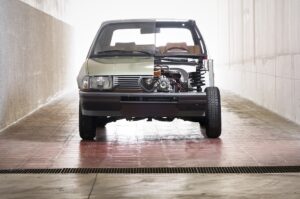 La macchina del tempo ci porta ad Arese, negli anni 80. Ancora Alfa Romeo. Ma questa volta rimaniamo fermi. L’Alfa 33 Quadrifoglio Oro non si muove, per mostrare i suoi segreti, sotto le lamiere: si tratta infatti di un prezioso “sezionato” che veniva esposto ai Saloni.