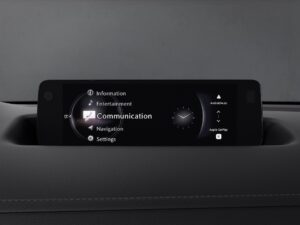 Passiamo agli aggiornamenti più sostanziali che riguardano la tecnologia di bordo. La Mazda MX-30 guadagna un nuovo sistema di infotainment, con un display centrale che cresce fino a 10,25 pollici. La compatibilità con Apple CarPlay e Android Auto diventa wireless, migliorando così la connettività e la praticità d’uso. Inoltre, il sistema di navigazione è stato ulteriormente ottimizzato: ora può indicare l’autonomia residua direttamente sulla mappa e suggerire le stazioni di ricarica lungo il percorso. Nuove anche le porte di ricarica che sono passate dalla ormai vetusta USB-A alla più recente USB-C.