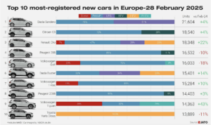 Tra gli altri brand del gruppo, calano anche Peugeot (-6,9%), Citroën (-13,4%) – pur restando tra i modelli più venduti d’Europa: a tal proposito la Citroën C3 è stata la seconda auto più venduta in Europa a febbraio, dietro la Dacia Sandero. Qui sotto le 10 auto più vendute a febbraio in Europa (fonte: JATO).