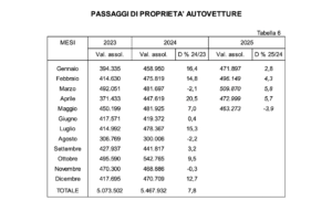I passaggi di proprietà delle sole automobili (al netto delle minivolture, ovvero i passaggi temporanei a nome del concessionario) sono stati 267.210, contro i 281.152 dello stesso mese del 2024. A conferma della tenuta del mercato, però, ogni 100 auto nuove immatricolate sono state vendute 189 usate: un rapporto che sale a 192 nel periodo gennaio-maggio 2025, confermando l’importanza dell’usato nel sistema di mobilità italiano.