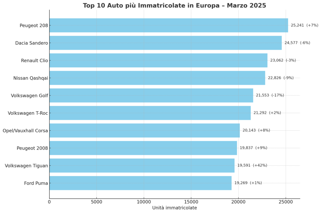 Secondo i dati della Jato, con 25.241 unità la Peugeot 208 è l’auto più venduta in Europa (+7%), secondo posto per la Dacia Sandero (-6%), che precede la Renault Clio, che registra 23.062 targhe (-3%). Cresce del 42% la Volkswagen Tiguan, che fa segnare 19.591 unità.