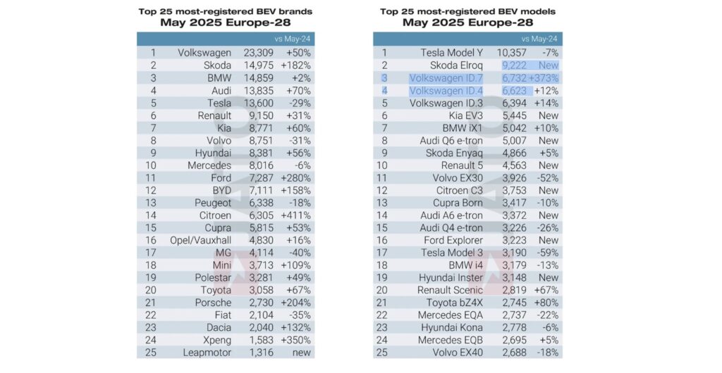 Considerando il consuntivo gennaio-maggio 2025 le immatricolazioni sono in leggera flessione (-0,6%), con 4.566.970 unità contro le 4.594.302 dello stesso periodo dell’anno precedente. Mentre contemplando l’Europa allargata, si registra un leggero aumento (+0,1%), con 5.572.458 targhe.