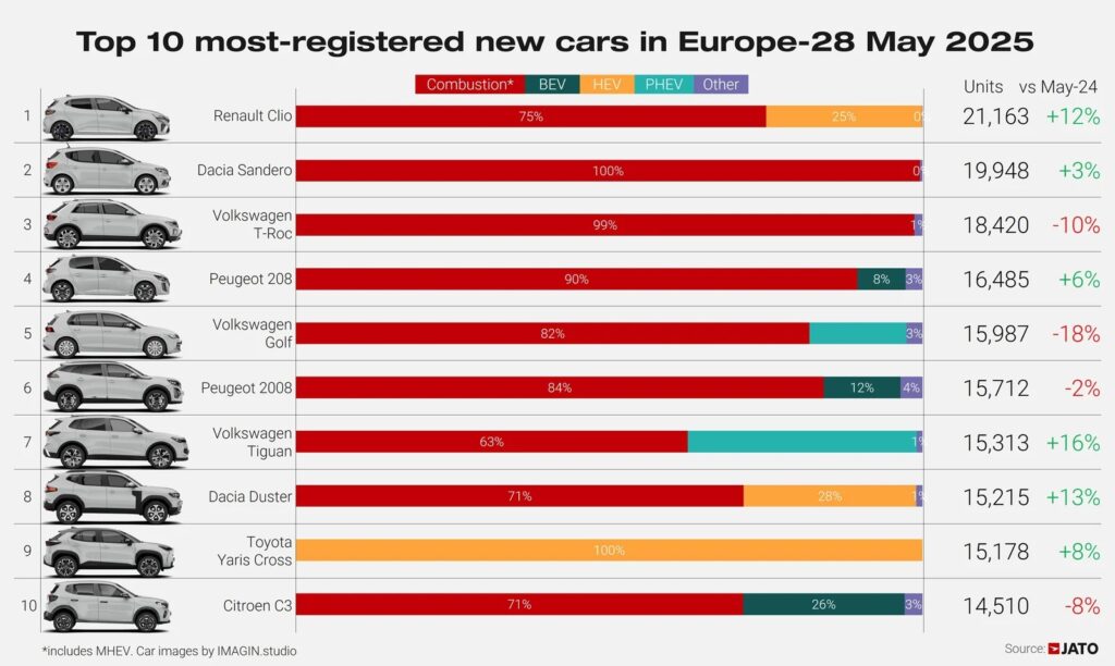 Secondo i dati delle Jato la Renault Clio con 21.163 unità è l’auto più venduta precedendo al secondo posto la Dacia Sandero con 19.948 vetture (+3%). Terzo posto per la Volkswagen T-Roc (-10%) e 18.420 targhe.