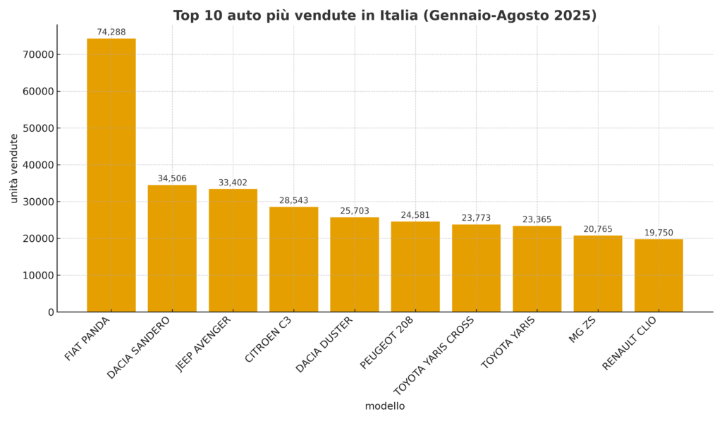 Nel periodo gennaio-agosto 2025, la Fiat Panda mantiene il primato con 74.288 unità vendute, seguita da Dacia Sandero (34.506) e Jeep Avenger (33.402).