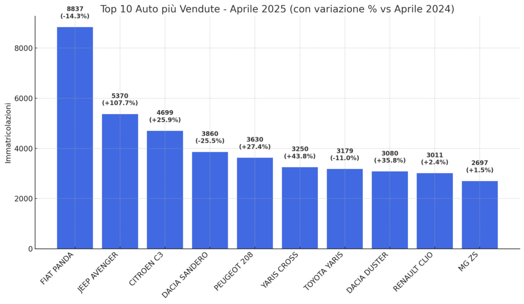 Guardando le 10 auto più vendute si può notare che la Panda è sempre la più venduta con 8.837 unità, seppur in calo rispetto allo stesso mese del precedente anno. Secondo posto per la Jeep Avenger, che immatricola 5.370 vetture, precedendo la Citroën C3 a quota 4.699. La Dacia Sandero scivolo in quarta posizione, con 3.860 targhe.
