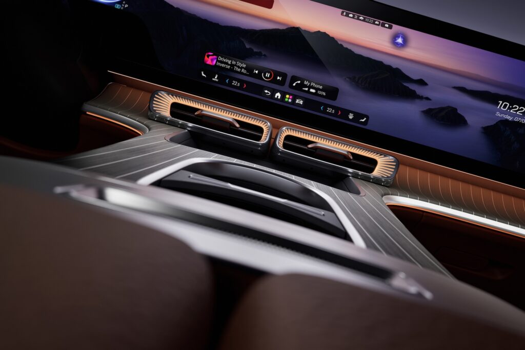 La caso Mercedes ha già depositato un brevetto per questa innovativa soluzione. Il sistema permette anche una regolazione intelligente dell’intensità luminosa, con la possibilità di controllare separatamente due aree dello schermo tramite cursori. L’esperienza utente viene potenziata dal sistema operativo proprietario Mercedes-Benz Operating System (MB.OS), che fonde fisico e digitale in un unico ambiente.
