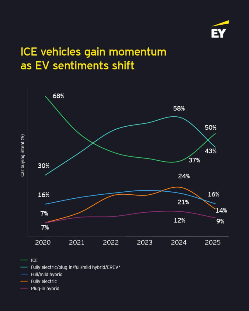 Cosa ci dice lo studio di EY? Secondo le risultanze della ricerca (leggi QUI), dopo anni di spinta verso l’elettrificazione, i consumatori stanno tornando a guardare con favore ai motori a combustione interna (ICE). Le evidenze dell’ultimo EY Mobility Consumer Index dicono che l’entusiasmo per la transizione elettrica si è raffreddato bruscamente, lasciando spazio a un pragmatismo dettato da incertezze economiche e limitazioni infrastrutturali.