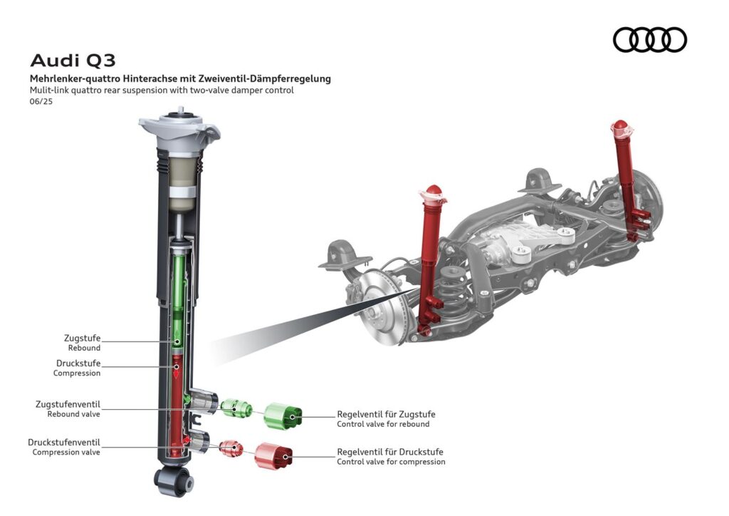 La nuova Audi Q3 è disponibile con assetto standard, che è stato rivisto, o con sospensioni sportive. In aggiunta, sono disponibili gli ammortizzatori adattivi a doppia valvola. Secondo la Casa dei Quattro anelli, lo sterzo progressivo (a richiesta), a servoassistenza e demoltiplicazione variabili, è sensibilmente più preciso rispetto alla precedente generazione di Audi Q3.