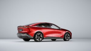L’impostazione è stata rivista per il segmento: la Mazda6e è una cinque porte hatchback, dissimulata da linee filanti che richiamano una coupé. In coda spicca lo spoiler retrattile elettricamente (attivo dai 90 km/h, oppure a richiesta di chi guida), mentre all’anteriore domina una calandra retroilluminata che funge anche da indicatore di stato della ricarica.