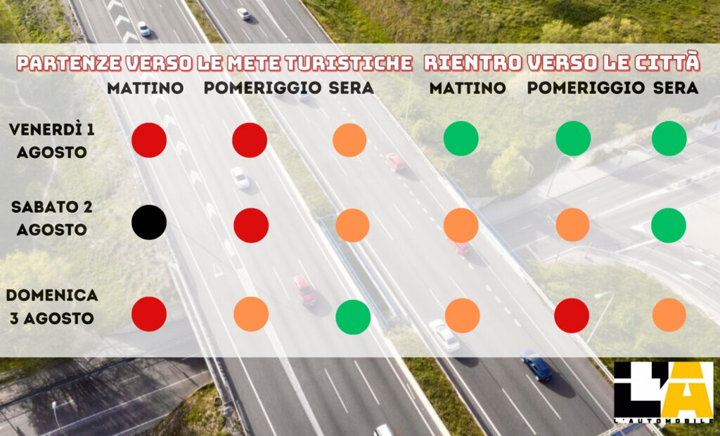 Secondo Autostrade per l’Italia, già a partire dal pomeriggio di venerdì 1 agosto è atteso traffico da bollino rosso (critico) sia alla mattina che al pomeriggio. Previsto grande movimento in uscita dai grandi centri urbani, soprattutto su tangenziali e raccordi autostradali (Milano, Roma, Torino, Napoli) e nelle zone limitrofe ai caselli.