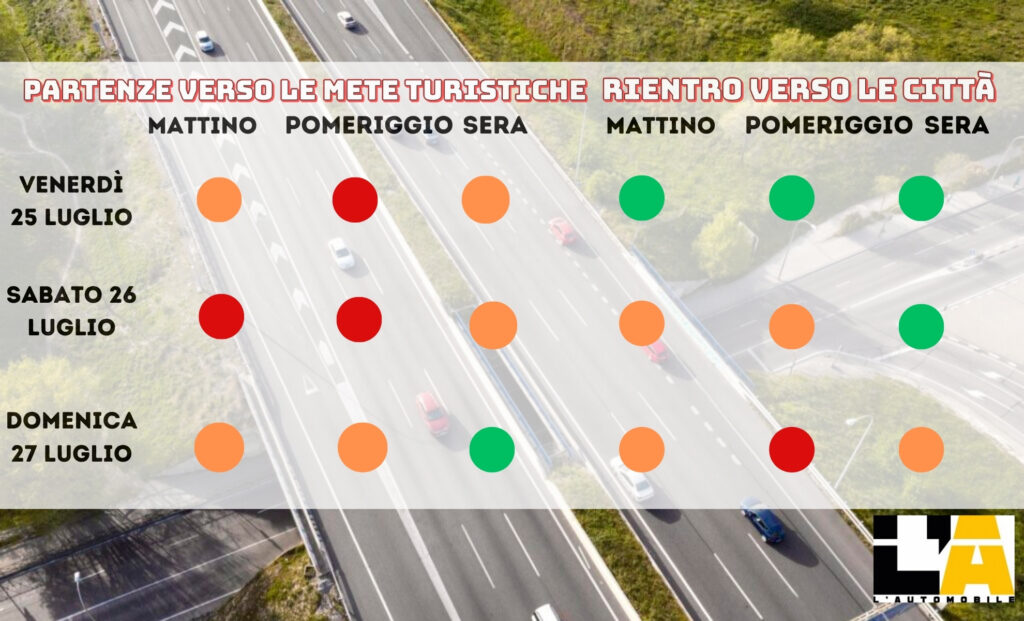 Secondo Autostrade per l’Italia, già a partire dal pomeriggio di venerdì 25 luglio è atteso traffico da bollino arancione (intenso con possibile criticità) alla mattina e rosso al pomeriggio. Previsto grande movimento in uscita dai grandi centri urbani, soprattutto su tangenziali e raccordi autostradali (Milano, Roma, Torino, Napoli) e nelle zone limitrofe ai caselli.