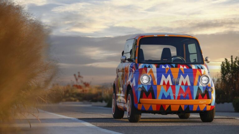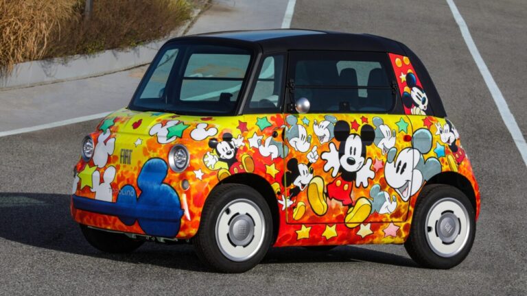 La narrazione prende avvio dall’ispirazione historical che attinge dalla grafica del pionieristico cortometraggio Disney intitolato “Steamboat Willie”. Quest’opera, acclamata dal pubblico, introdusse una rivoluzione: la sincronizzazione del suono con l’animazione ed è stata poi resa immortale entrando al MoMA di New York. Sul disegno modern, ispirato all’arte moderna, spicca una trama con le iniziali di Mickey Mouse. Dà un senso di energia positiva e testimonia la visione futura comune a Fiat e Disney in maniera brillante, colorata ed ottimista, evidenziando lo status di icone dei due brand sia nell’arte sia nella cultura moderna. La livrea abstract omaggia un altro aspetto della creatività Disney: il modo in cui il brand rinnova gli spunti stilistici classici attraverso tocchi grafici e simboli astratti, regalando un impatto visivo molto forte, ma anche una profonda sensazione di eleganza.